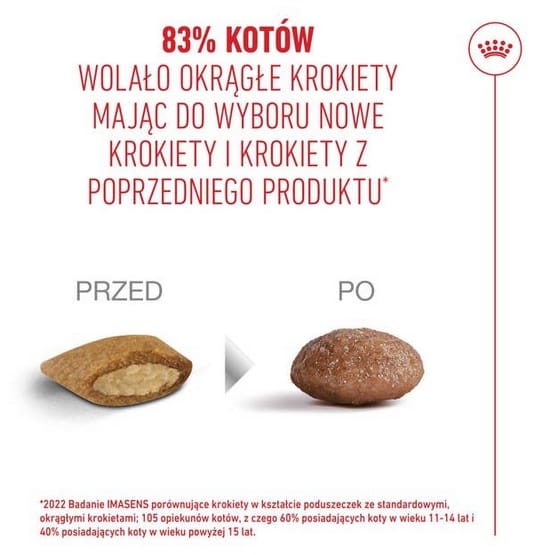 Royal Canin Ageing +11 karma sucha dla kotów dojrzałychSucha karma ROYAL CANIN® AGEING 11+ opracowana została specjalnie dla kotów w wieku powyżej 11 lat. Krokiety w karmie ROYAL CANIN® AGEING 11+ zostały opracowane i przetestowane przez koty starsze tak, aby ułatwić im jedzenie i sprawić, aby każdy posiłek był przyjemnością. Wyjątkowa receptura, zawierająca kompleks HealthyAge7™, dostarcza precyzyjnie dobrane składniki pokarmowe, które pomagają wspierać 7 kluczowych obszarów związanych ze zdrowiem i witalnością kotów starszych: