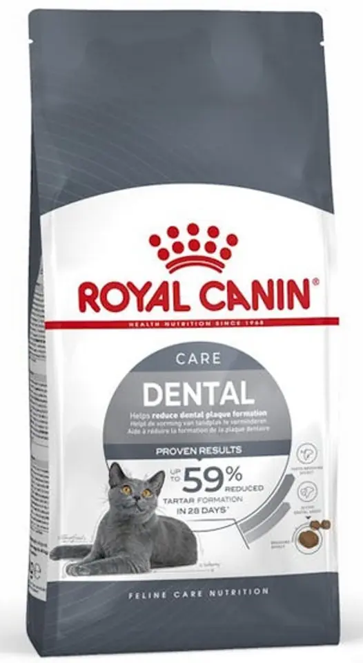 W kontakcie ze śliną płytka nazębna ulega procesowi mineralizacji, co prowadzi do odkładania kamienia nazębnego. Z czasem staje się to przyczyną zapalenia dziąseł, przykrego oddechu i wypadania zębów. Karma DENTAL CARE to precyzyjne i optymalnie zbilansowane rozwiązanie żywieniowe, stworzone do optymalnej higieny jamy ustnej. Podwójne działanie: - Efekt mechanicznego czyszczenia: unikalny kształt i tekstura krokieta zapewniają w trakcie jedzenia mechaniczny efekt czyszczący, co sprzyja usuwaniu płytki nazębnej. - Polifosforan sodu: aktywna substancja, która wiążąc wapń obecny w ślinie, zapobiega jego odkładanie na zębach i powstawaniu kamienia nazębnego. UDOWODNIONA SKUTECZNOŚĆ: do 59% redukcji odkładania się kamienia nazębnego po 28 dniach podawania kotu wyłącznie karmy DENTAL CARE*. *Przed rozpoczęciem badania u wszystkich kotów usunięto kamień nazębny. Pomiar wykonano na najbardziej podatnych zębach, porównanie z karmą kontrolną niezawierającą polifosforanu sodu, badanie własne Royal Canin, 2005.SKŁAD:suszone białko drobiowe, ryż, gluten pszenny*, tłuszcze zwierzęce, kukurydza, mąka kukurydziana, włókno roślinne, hydrolizowane białka zwierzęce, pszenica, gluten kukurydziany, minerały (w tym trójfosforan pięciosodowy (0,2%)), wysłodki buraczane, olej z ryb, olej sojowy, fruktooligosacharydy, łuski i nasiona psyllium.*L.I.P.białko wyselekcjonowane ze względu na bardzo wysoką przyswajalność.DODATKI (na 1 kg karmy)Dodatki dietetyczne: Witamina A: 14000 UI, Witamina D3: 700 UI, Żelazo (3b103): 35 mg, Jod (3b201, 3b202): 3,5 mg, Miedź (3b405, 3b406): 11 mg, Mangan (3b502, 3b504): 45 mg, Cynk (3b603, 3b605, 3b606): 133 mg, Selen (3b801, 3b811, 3b812): 0,06 mg - Przeciwutleniacze.SKŁADNIKI ANALITYCZNEBiałko surowe: 30,0% - Oleje i tłuszcze surowe: 15,0% - Popiół surowy: 7,1% - Włókno surowe: 5,3%.DAWKOWANIE