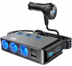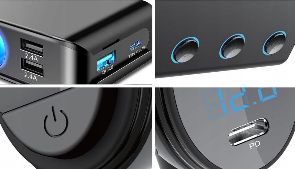 Ładowarka USB z rozdzielaczem zapalniczki - każde gniazdo zapalniczki oddzielnie włączane, 1 port USB QC3.0 + 2 porty USB TYP C PD + 2 porty USB AUTO ID!