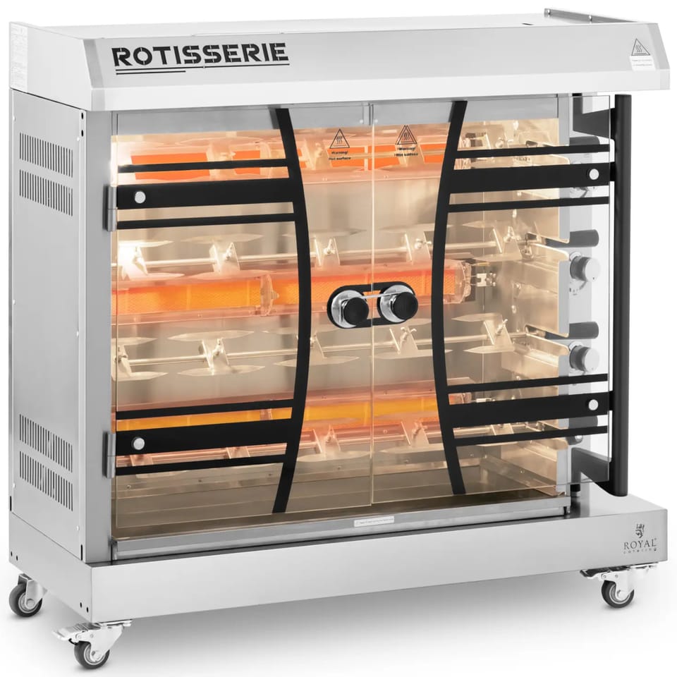 Kod producenta: 10013255Gazowy rożen do kurczaków marki Royal Catering pozwala zaoferować klientom pyszne kurczaki, rostbefy, porchetty, pieczenie i wiele innych świeżo przygotowanych i chrupiących przysmaków. Na czterech obracających się szpikulcach, z których każdy mieści 4 kurczaki, można upiec ulubione specjały, równomiernie, delikatnie i z chrupiącą skórką. Każdą grzałkę można włączać i wyłączać, co pozwala przygotować różne potrawy w tym samym czasie. Urządzenie ma całkowitą moc 3 x 5,5 kW, więc działa szczególnie wydajnie i niezawodnie. Żaroodporne drzwi ze szkła hartowanego zapewniają doskonały widok na jedzenie przez cały czas grillowania. Oświetlenie wnętrza pozwala również zaprezentować przysmaki w najlepszym świetle. Obudowa ze stali nierdzewnej dopełnia profesjonalnego wrażenia. Materiał ten nie pochłania smaku ani zapachów, jest szczególnie wytrzymały i bardzo łatwy w czyszczeniu. Cztery koła pozwalają łatwo ustawić opiekacz w dowolnym miejscu. Solidna konstrukcja i dwa hamulce postojowe gwarantują mu stabilność.Cechy produktu:
