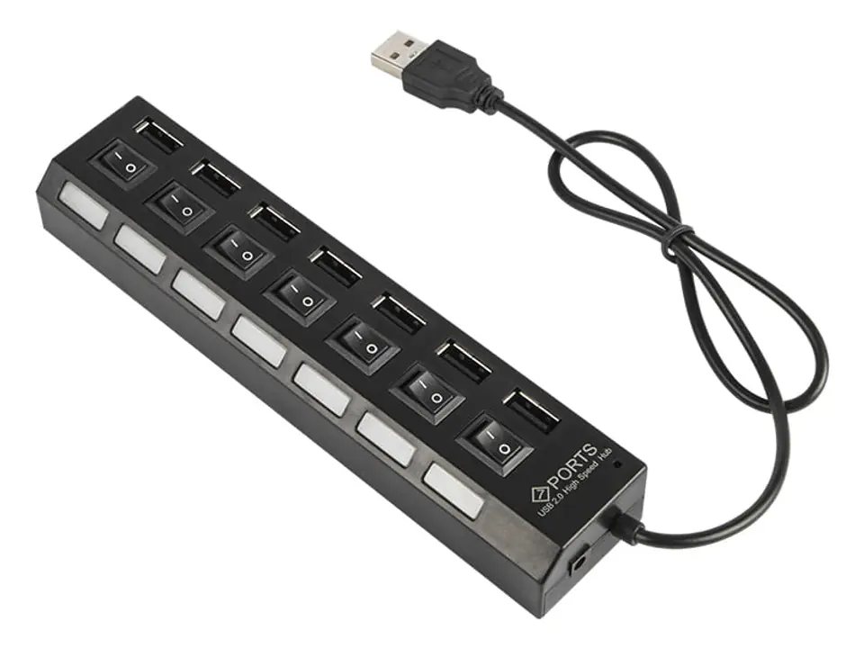 Rozgałęziacz (HUB) USB na 7 portów USB 2.0 umożliwia podłączenie do siedmiu urządzeń takich jak dyski twarde czy pendrive. Każdy z portów posiada swoje włączniki oraz diody sygnalizujące pracę urządzenia. HUB cechują także niewielkie wymiary, nowoczesny design oraz wysoka prędkość działania.