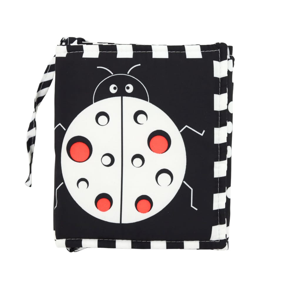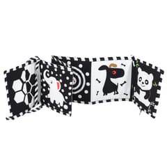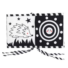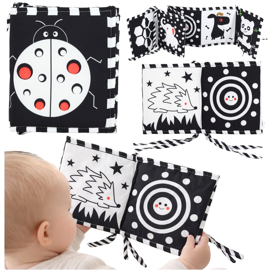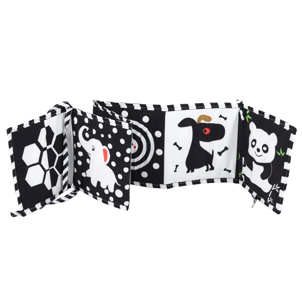 Książeczka została zaprojektowana w kontrastowych kolorach czerni i bieli, które są najlepiej postrzegane przez noworodki i małe dzieci. Urocze, wyraźne wzory zwierząt oraz geometrycznych kształtów przyciągają uwagę dziecka i zachęcają do obserwacji. Dzięki zastosowaniu kontrastowych ilustracji zabawka wspiera wczesny rozwój wzroku oraz stymuluje rozwój mózgu. Produkt może być rozłożony na podłodze jako mata do zabawy lub ustawiony w formie książeczki do oglądania.