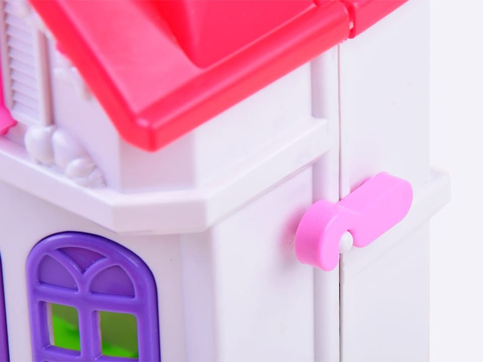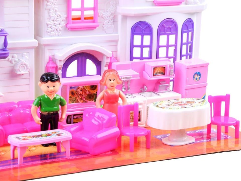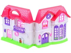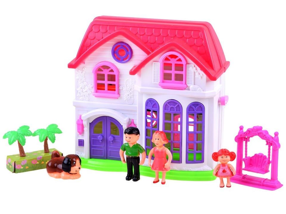 Elegancki, rodzinny domek dla lalek zapewni każdemu dziecku wyśmienita zabawę. Zestaw w całości wykonany jest z plastiku w żywych atrakcyjnych kolorach, z efektownym wykończeniem domu. Domek jest w wersji rozkładanej, na fasadzie posiada śliczne wytłoczenia kwiatuszków oraz ptaszków. Na każdym piętrze dziecko może stworzyć indywidualny wygląd pokoju, dzięki zamieszczonym w zestawie naklejkom oraz różnym mebelkom. Dodatkowym atutem jest dzwonek z efektem świetlnym, dzięki niemu zawsze wiadomo będzie, że ktoś wchodzi do domu. Figurki lalek są mają ruchome ręce, i obrotową głowę, są kolorowo ubrane.Zestaw składa się z:- rozkładany domek- figurki lalek: mama, tata, córka, piesek- toaletka- łóżko- huśtawka- telewizor- szafka pod telewizor- fotel- sofa- ława- stół- krzesła- meble kuchenne- lodówka- podstawka z palmami- tekturowy dywan- kolorowe naklejkiWymiary:Domek:- wysokość: 25 cm- długość rozłożonej wersji: 48 cm- szerokość złożona wersja: 10 cmLalka:- wysokość: ok. 8,5 cm