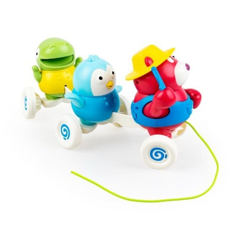 Rozkołysane Zwierzaki Pociąg z trzema wesołymi pasażerami czeka na przejażdżkę! Zabawka wyposażona jest w sznureczek do prowadzenia rączką. Podczas jazdy, zwierzaki kołyszą się na boki, podobnie jak kółeczka pojazdu, które ozdobione są wzorkiem, przez co ich poruszanie się wywołuje ciekawy efekt wizualny. Pociąganie za sznureczek uruchamia zabawne dźwięki i melodie, które umilą zabawę. Cechy produktu: - do prowadzenia na sznureczku; - przy prowadzeniu zwierzaki kołyszą się na boki; - melodie; - zabawne dźwięki; Baterie: 3 x AAA (niezawarte w zestawie); Wiek: 12m+