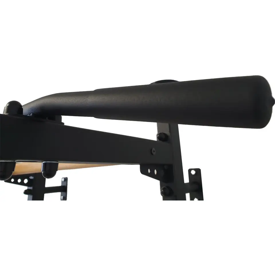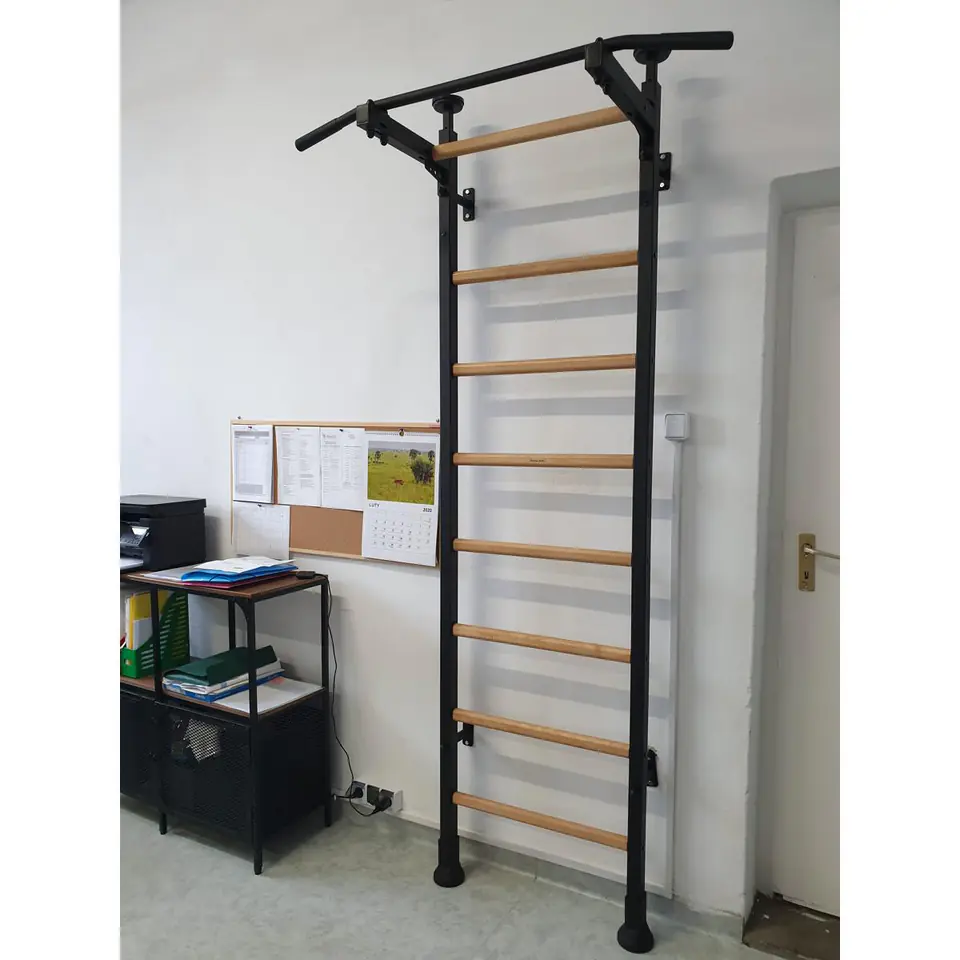Drabinka gimnastyczna to model, który idealnie pasuje do skandynawskiego stylu wnętrz. Pionowe profile (40mm x 50 mm) wykonane są z wysokiej jakości metalu pomalowanego proszkowo. Szczebelki są wykonane z buku o owalnym kształcie, powierzchnia szczebelków jest olejowana ręcznie, to wszystko wpływa na to, że użytkowanie drabinki jest komfortowe. W górnej części drabinki znajduje się montowany na stałe metalowy drążek do podciągania, praca siłą mięśni ramion i pleców za pomocą różnych chwytów. Drabinka stworzona została z myślą o osobach, które chcą pracować nad swoją sylwetką w zaciszu swojego domu. Drabinka pozwala wykonywać wiele różnorodnych ćwiczeń, nie zajmując przy tym dużo miejsca. Jej montaż jest bardzo łatwy, a design przemyślano tak, aby pasował do aktualnych trendów w aranżacji wnętrz, nie zaburzając ogólnego wystroju mieszkania. Parametry:• szerokość 0,67 m• wysokość 2,30 m - 2,40 m• wysokość pomieszczenia do instalacji od 240 cm do 275 cm• sposób mocowania - do ściany (4 uchwyty) lub rozporowy (podłoga-sufit) od 240 cm do 275 cm• waga 26 kg• kolor czarny mat (metalowe elementy) oraz drewno bukowe w kolorze dębu• materiał metal, drewno buk• gwarancja na metalowe elementy 10 lat• gwarancja na inne materiały 2 lata• produkt Polski wyprodukowany zgodnie z normami PN-EN 12346:2001, PN-EN 913:2008• Seria BenchK 511Zestaw zawiera:• drabinka gimnastyczna (8 bukowych owalnych szczebelków drewnianych o wymiarze 30x40 mm• 2 metalowe pionowe profile metalowe 40 mm x 50 mm• metalowy drążek do podciągania montowany na stałe u góry• zestaw do montażu (oprócz kołków i wkrętów do ściany, które należy dobrać w zależności od rodzaju ściany do której drabinka gimnastyczna będzie mocowana)Zaletą drabinki jest szczebelek umieszczony w górnej części na konsolach drążka, który daje dodatkowe możliwości ćwiczeń.Do drabinki można dokupić dodatkowy osprzęt: poręcze do ćwiczeń oraz ławkę.