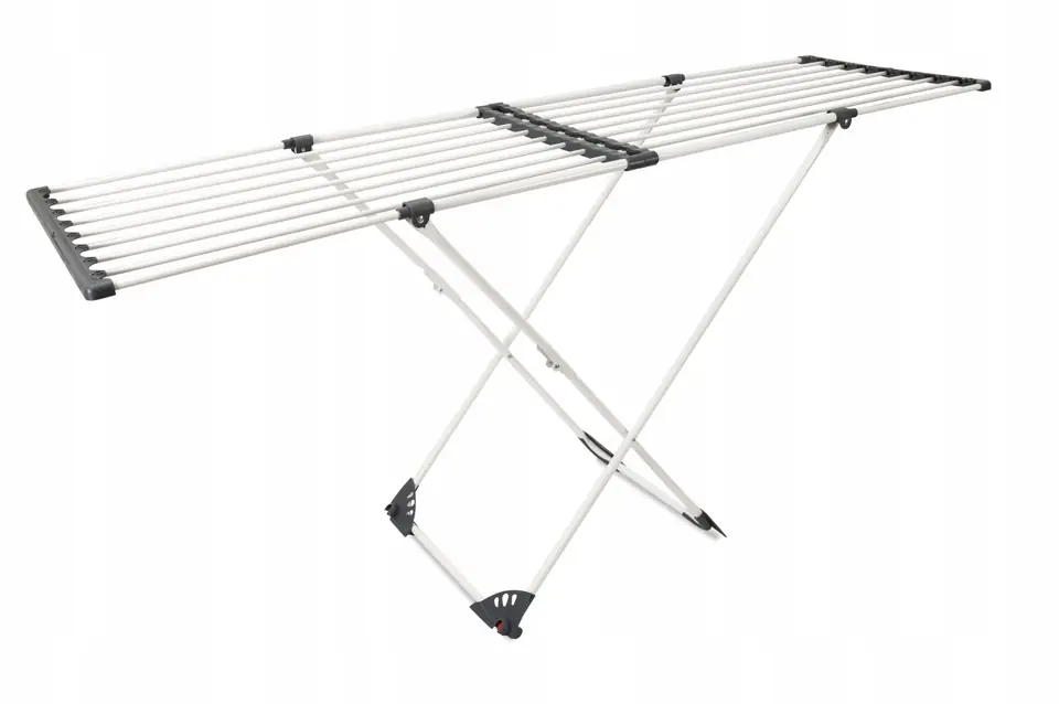 Suszarka pozioma, stojąca, posiada rozsuwane skrzydła, które umożliwiają suszenie większej ilości ubrań. Skrzyła są teleskopowe, a nie jak w większości suszarek składane (do środka). Dzięki temu skrzydła wysuwasz tylko wówczas gdy jest potrzeba. Dzięki grubym drutom zapobiega powstawaniu zagnieceń na częściach garderoby jednocześnie skracając proces prasowania.