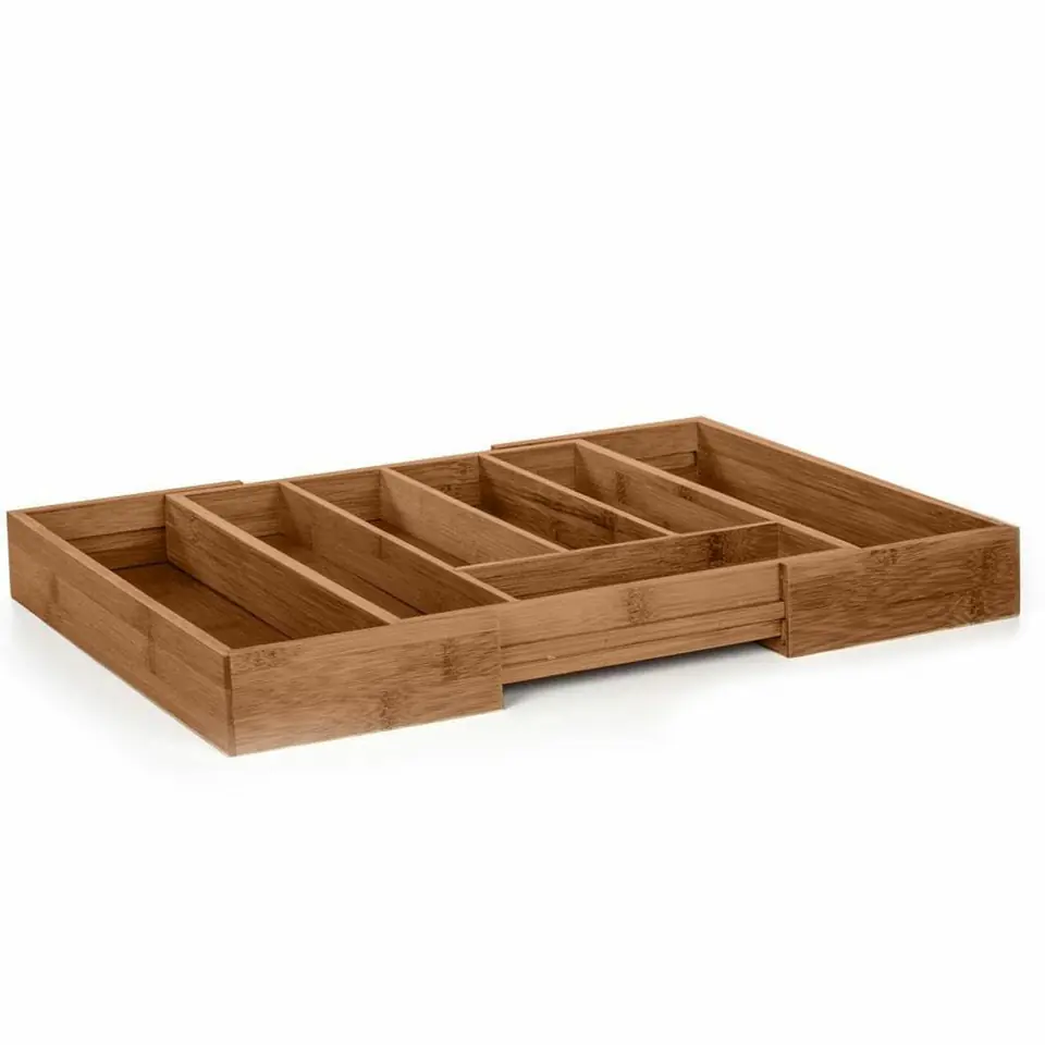Pomysłowa taca z przegródkami na sztućce, wykonana z bambusa. Dodatkowo rozsuwana. Wygodna i praktyczna w wykorzystaniu np. przy przyjęciu ogrodowym ale również jako wypełnienie w szufladzie kuchennej.