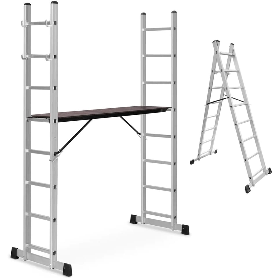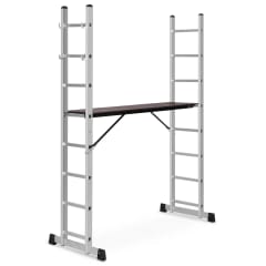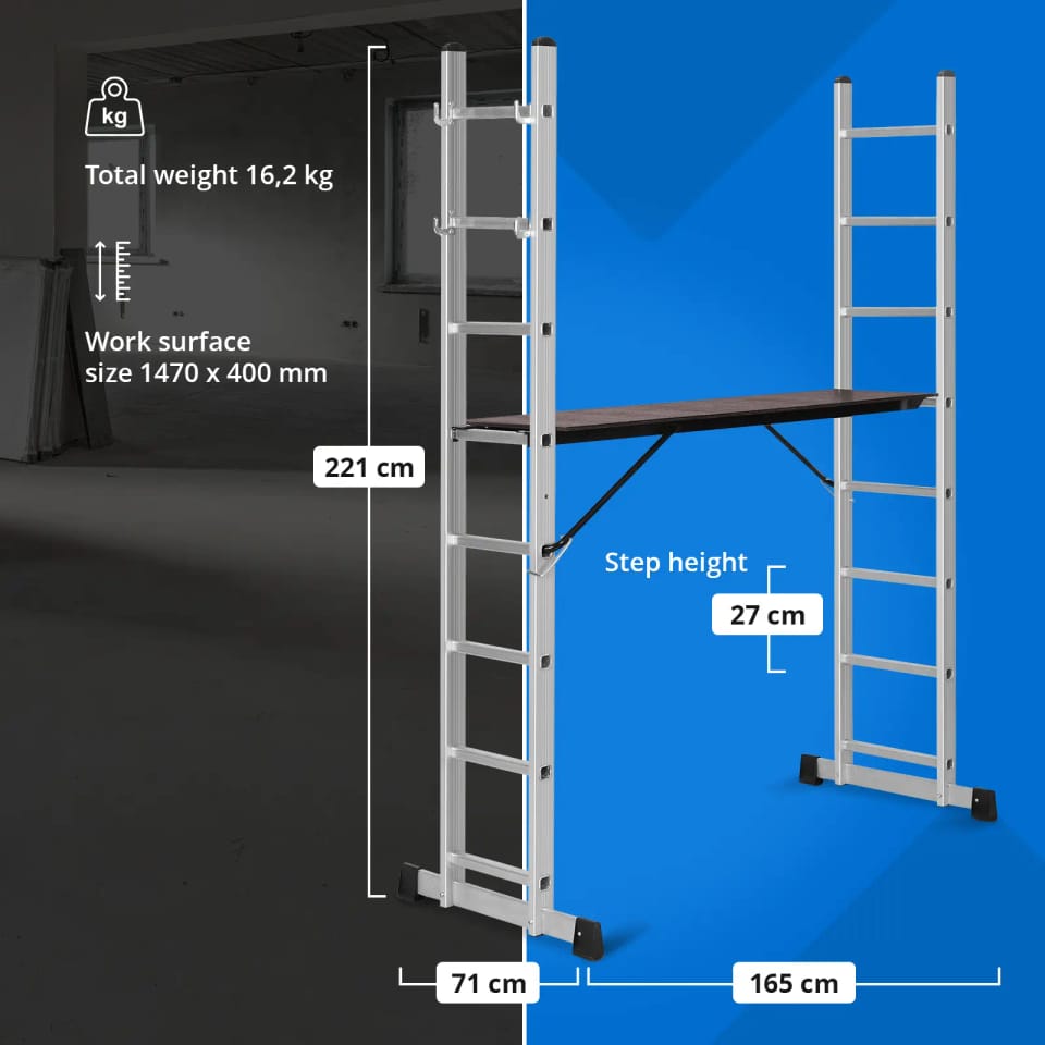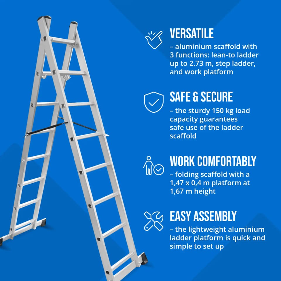 - - Rusztowanie aluminiowe można wykorzystać na 3 sposoby: jako drabinę przystawną o wysokości do 3,8 m, drabinę wolnostojącą i rusztowanie robocze,