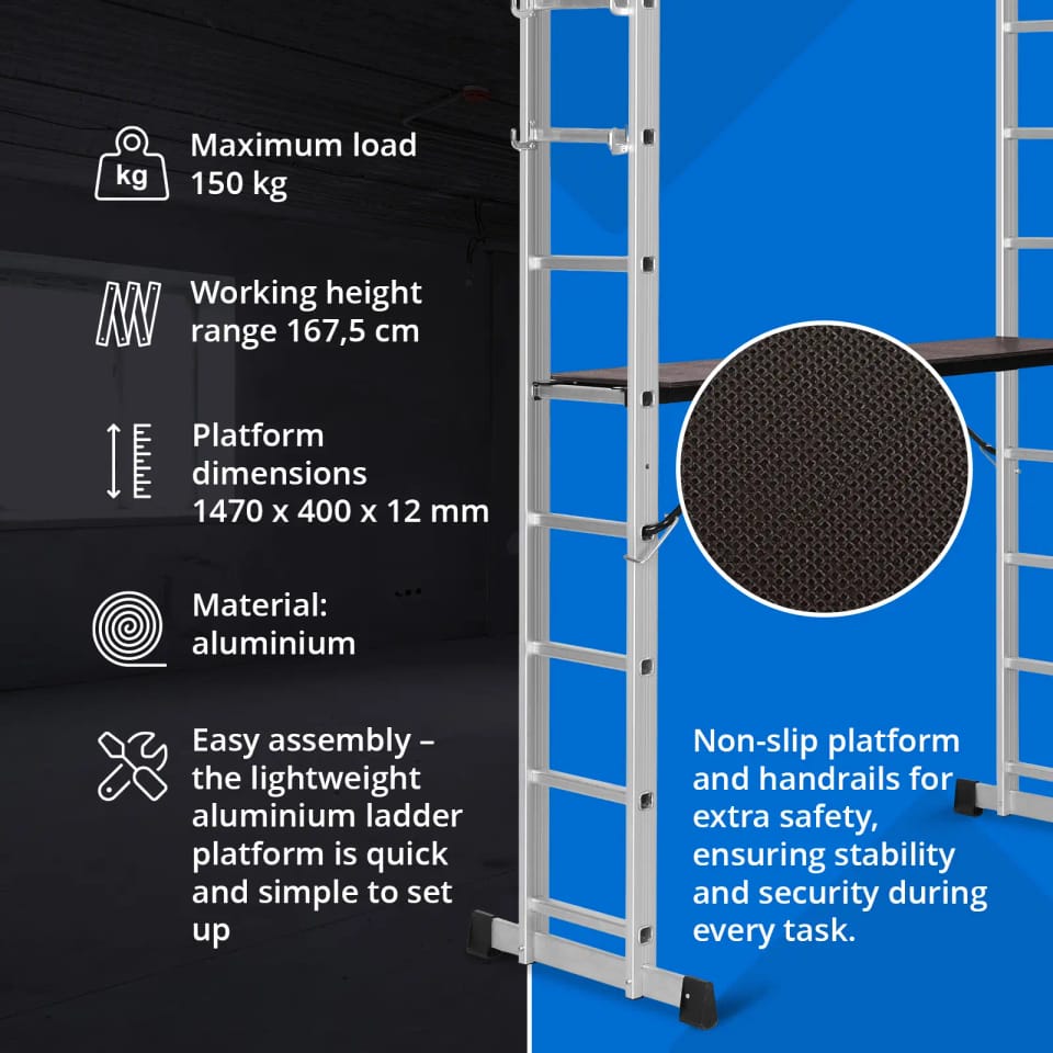 - - Wysoka nośność rusztowania drabinowego do 150 kg zagwarantuje bezpieczne i niezawodne użytkowanie,