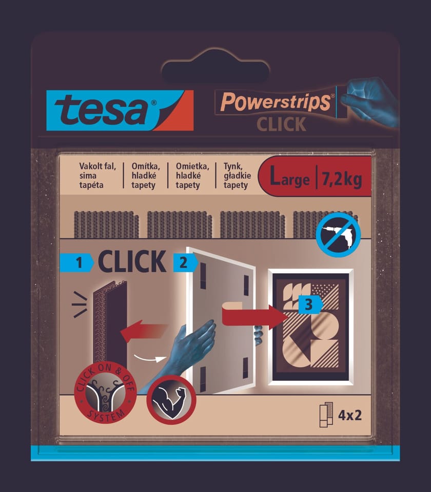 - Niezawodna przyczepność Dzięki samoprzylepnym właściwościom, rzepy samoprzylepne Powerstrips® CLICK zapewniają solidne mocowanie elementów, zapewniając ich stabilność przez długi czas