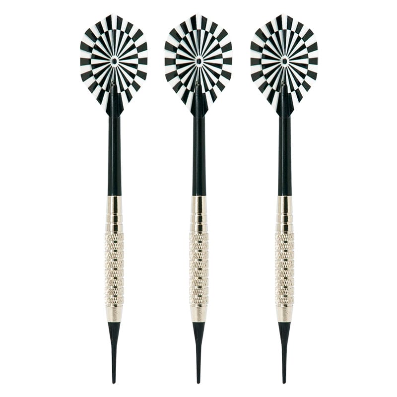 Wysokiej jakości zestaw trzech rzutek typu SOFTIP do darta. Produkt przeznaczony dla amatorów oraz profesjonalnych zawodników. Czarne etui z tworzywa skrywa trzy niklowane beczki (barells) z wkręcanymi, nylonowymi grotami. Beczki wyposażono w nylonowe nasadki (shafts). Zestaw zawiera także komplet piórek z kolorową grafiką. Typ: SOFTIPMateriał: mosiądz niklowany, nylon, PVCWaga rzutki: 18g