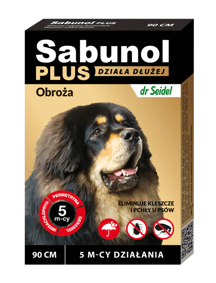 Sabunol PLUS to nowoczesna obroża przeciw kleszczom i pchłom dla psów. Nowa technologia produkcji i inna forma paska obroży zapewnia równomierne oraz długotrwałe uwalnianie się trzech składników aktywnych: permetryny, imidachloprydu i geraniolu. Dzięki temu obroża jest skuteczna przez 5 miesięcy. Badania potwierdzają wysoką tolerancję miejscową i ogólną co sprawia, że obroża jest bezpieczna podczas stosowania. Efekty działania obroży są już widoczne po 5 godzinach od jej założenia.