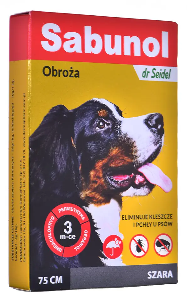Sabunol GPI to nowoczesna obroża przeciw kleszczom i pchłom dla psów, skuteczna i wygodna w użyciu. Unikatowe połączenie trzech składników: permetryny, imidachloprydu i geraniolu zapewnia skuteczność działania przez 3 miesiące. Badania potwierdzają wysoką tolerancję miejscową i ogólną co sprawia, że obroża jest bezpieczna podczas stosowania.