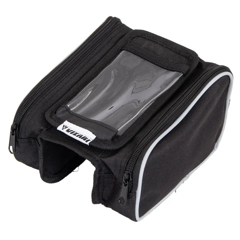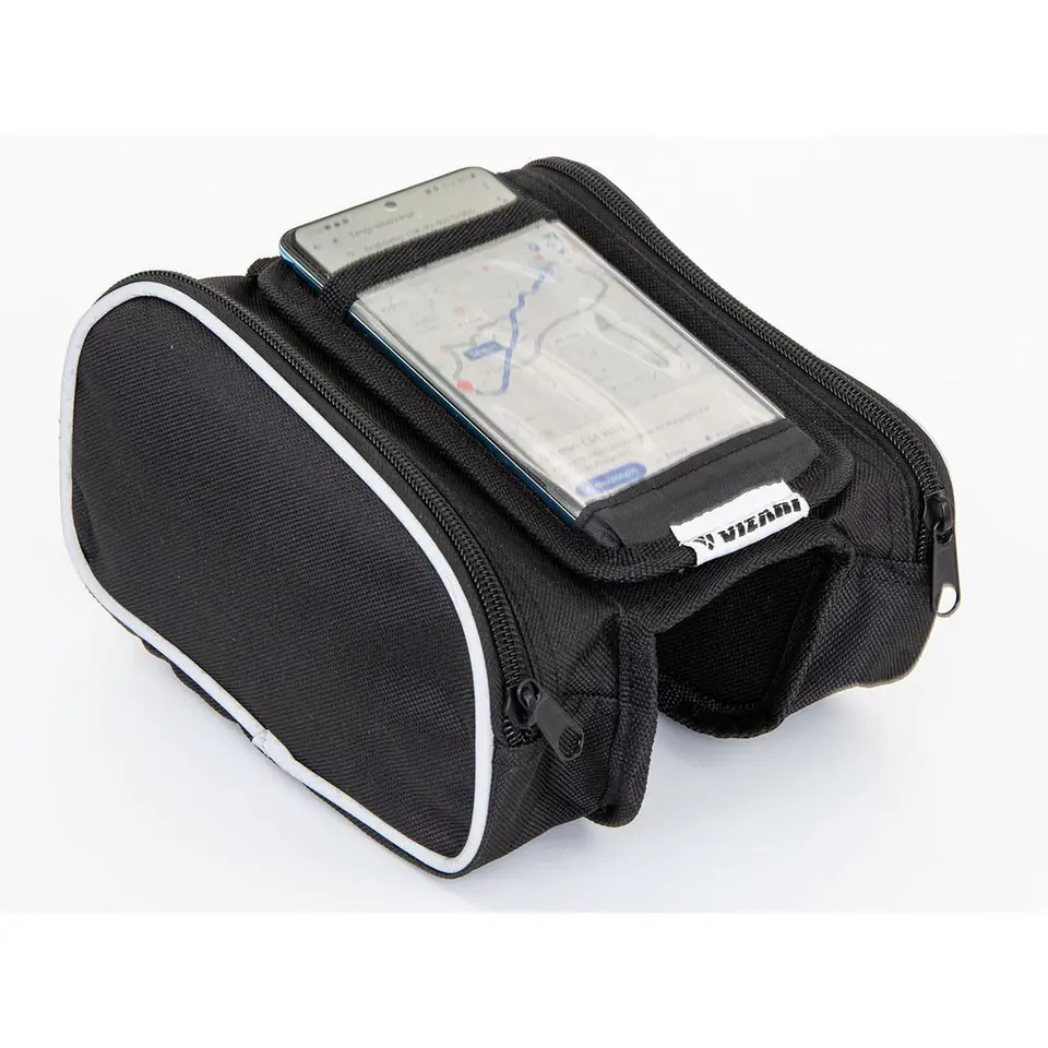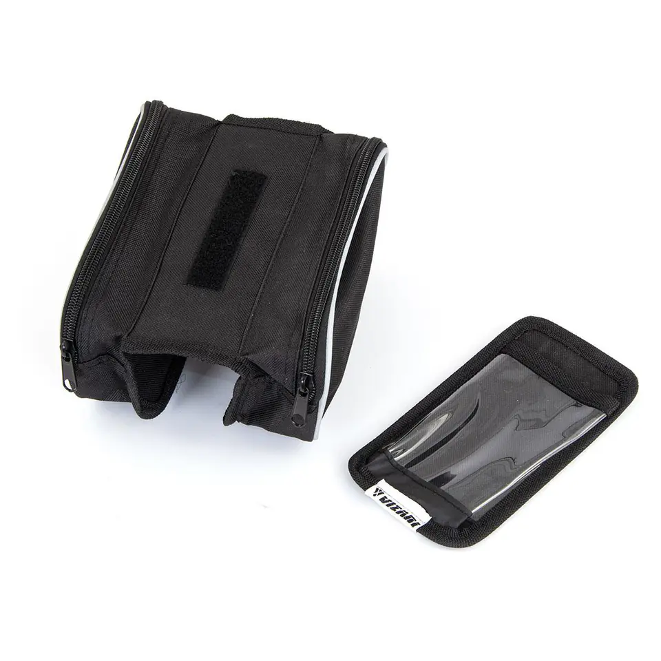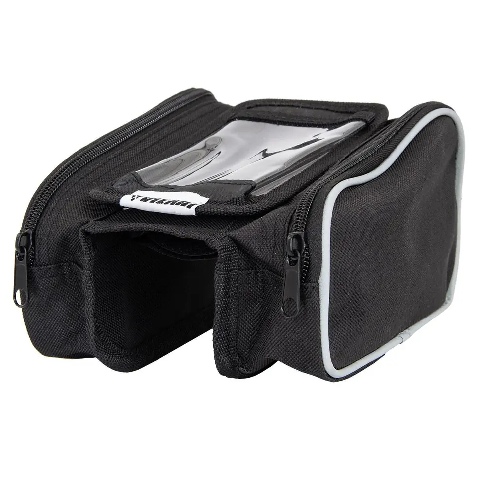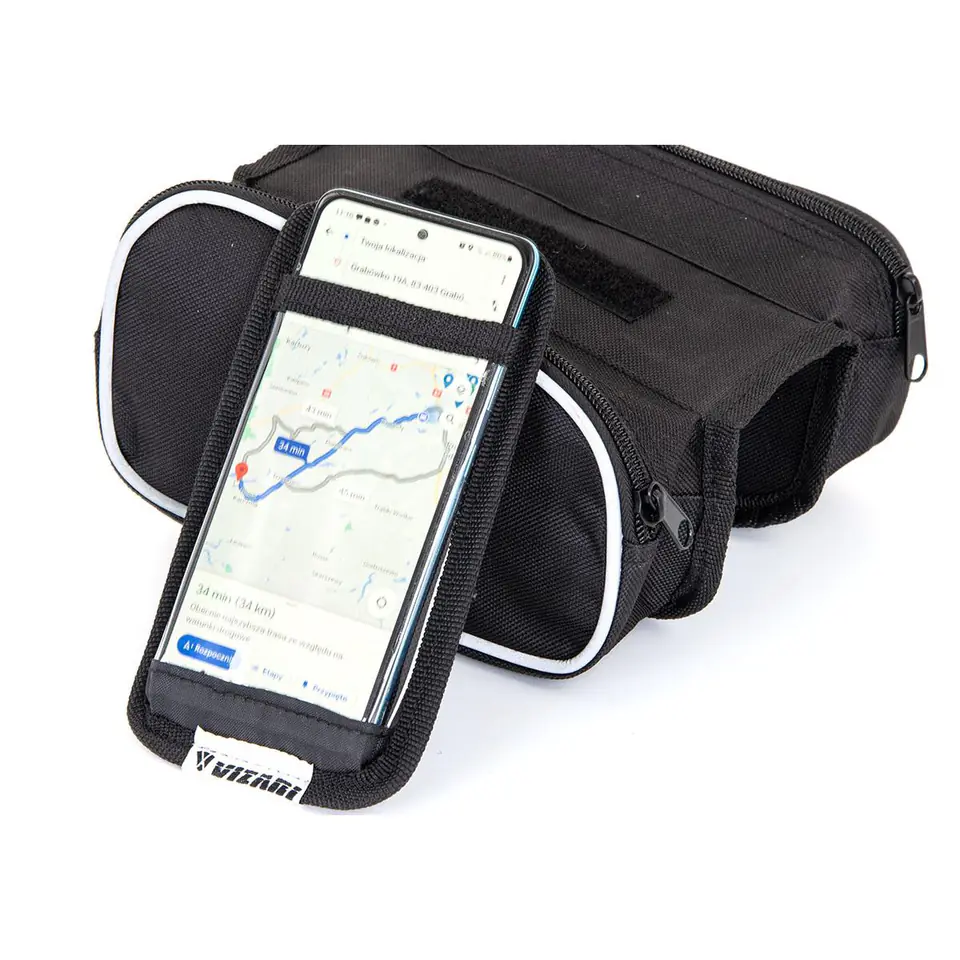 - centralną pozycję zajmuje zdejmowane etui z przeźroczystą kieszonką widoczną z pozycji jadącego, co ułatwia np.: obserwowanie trasy na mapie w telefoniedwie boczne sakwy zamykane na zamek pozwolą schować niezbędne rzeczy w zasięgu rękibrzegi torby obszyte odblaskowa lamówką, zwiększą bezpieczeństwo na drodzedobrej jakości materiał i mocne przeszycia pozwolą na użytkowanie torby przez wiele sezonówmocne regulowane rzepy pozwolą zamontować sakwę na ramę o dowolnej średnicykieszonka na telefon jest odpinana na rzep, można ją oddzielić od torby w każdej chwili