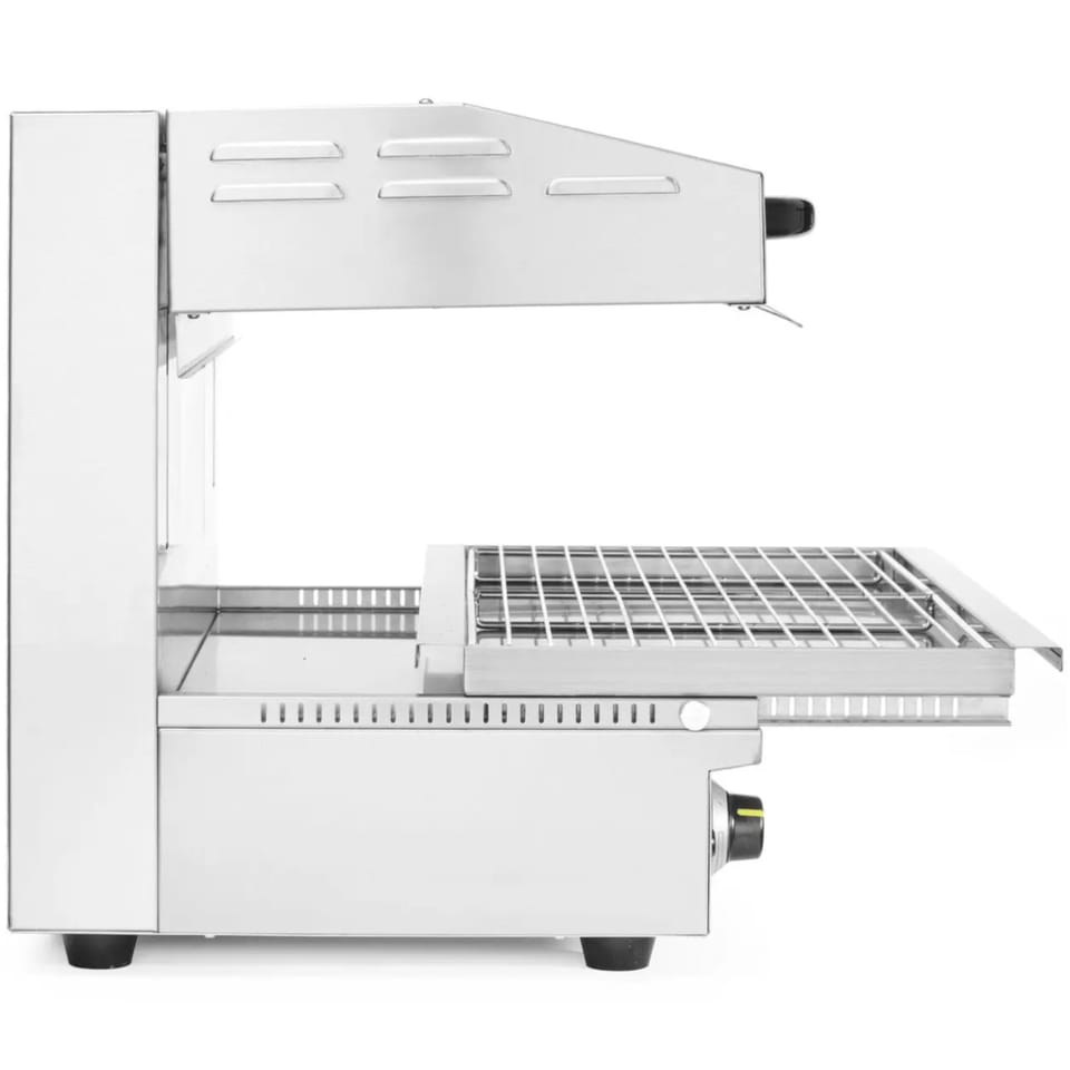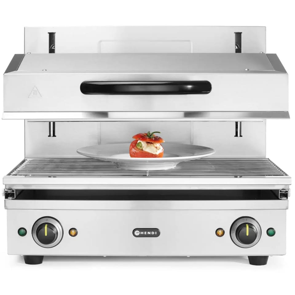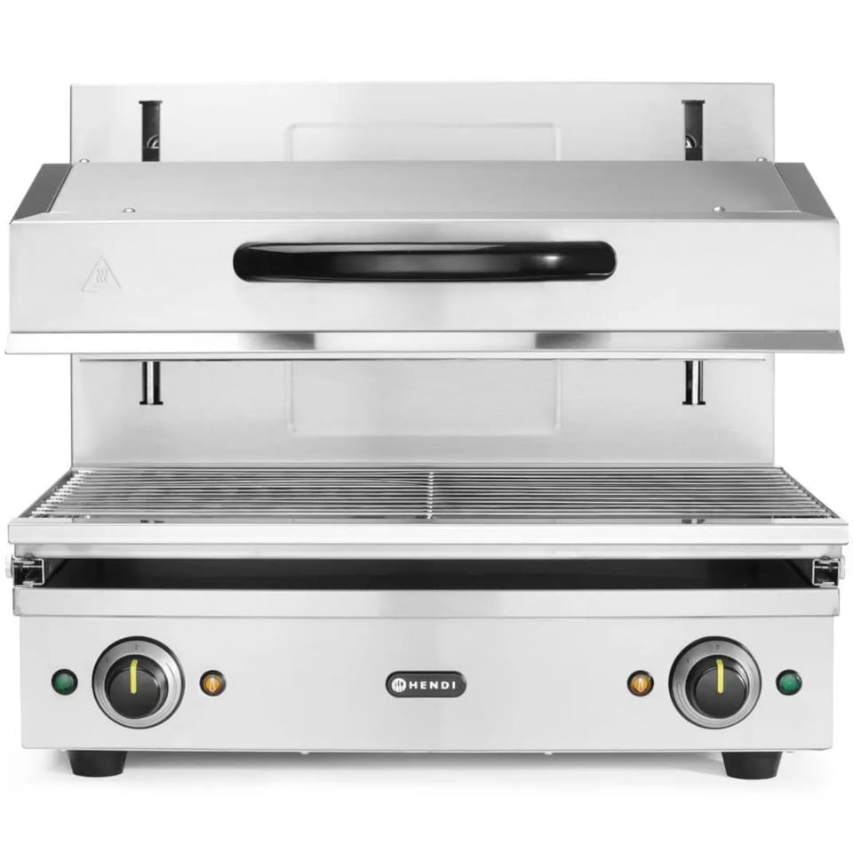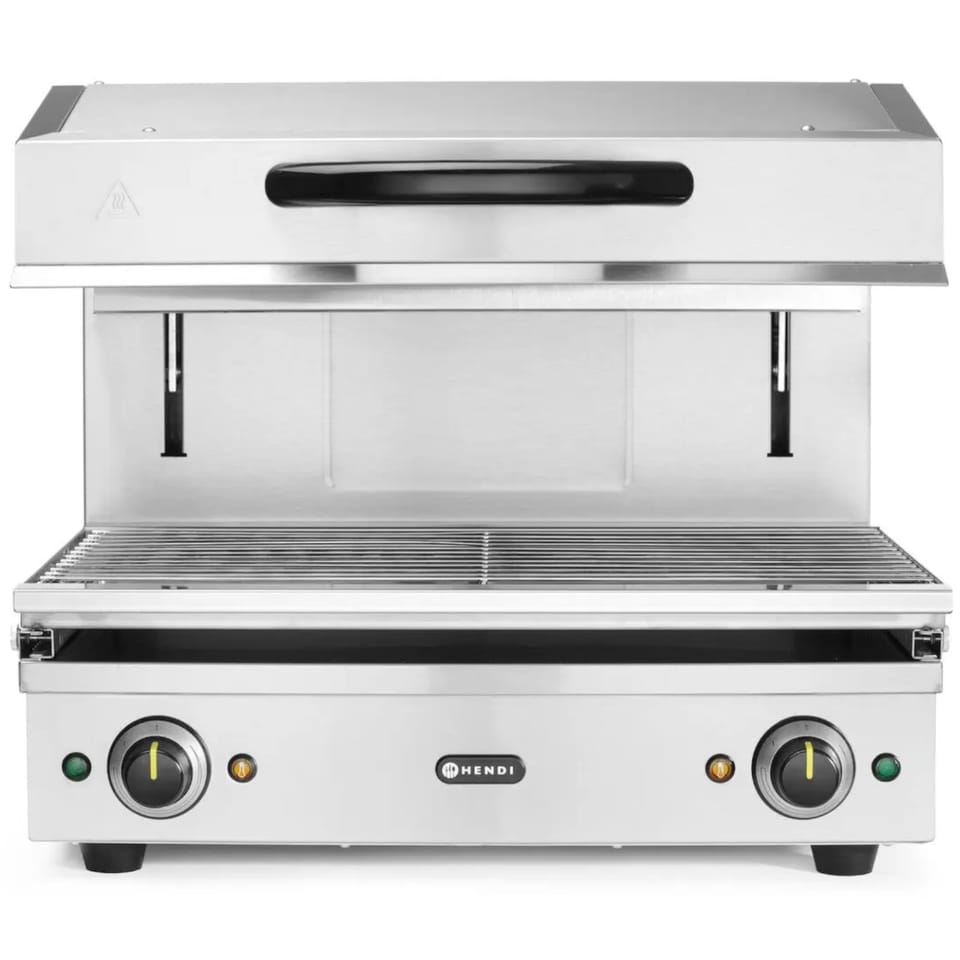 Kod producenta: HENDI 264706Salamander 600 HENDI umożliwia płynną regulację wysokości za pomocą idealnie działającego systemu podnoszącego w zakresie od 70 do 200 mm, zapewniając precyzyjną kontrolę podczas takich czynności jak grillowanie, opiekanie, topienie sera czy finalne wykańczanie potraw. Mechanizm zębatkowo-łańcuchowy zapewnia niezawodną codzienną pracę, a wyjmowana taca ociekowa i na okruchy z rusztem o wymiarach 590×350 mm ułatwia szybkie i efektywne czyszczenie.Cechy produktu: