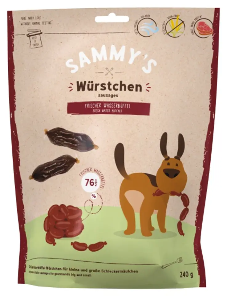 Pyszne smakołyki dla młodszych i starszych psiaków: ulubiona, obfita kiełbasa Sammy'ego z pysznego bawoła wodnego.Soczyste kawałki z bawoła wodnego są świeżo i starannie przetwarzane na małe kiełbaski. Późniejsze suszenie na powietrzu szczególnie dobrze zachowuje cenne składniki odżywcze zawarte w przekąsce.Gwarancja: bez aromatów, dodatku cukru czy zbóż.Nagroda, aby cieszyć się i rozpieszczać.Skład:Bawół słodkowodny (76,5%), białko bawoła wodnego (suszone, 20%), kolagen (jelita, 1,5%).Skład analityczny:Energia 3178 kcal/kg (13,30 MJ/kg), wilgotność 30,0%, białko 30,0%, zawartość tłuszczu 20,0%, włókno surowe 1,5%, popiół surowy 11,0%.Dodatki:Dodatki technologiczne: Przeciwutleniacze, konserwanty.Dawkowanie: