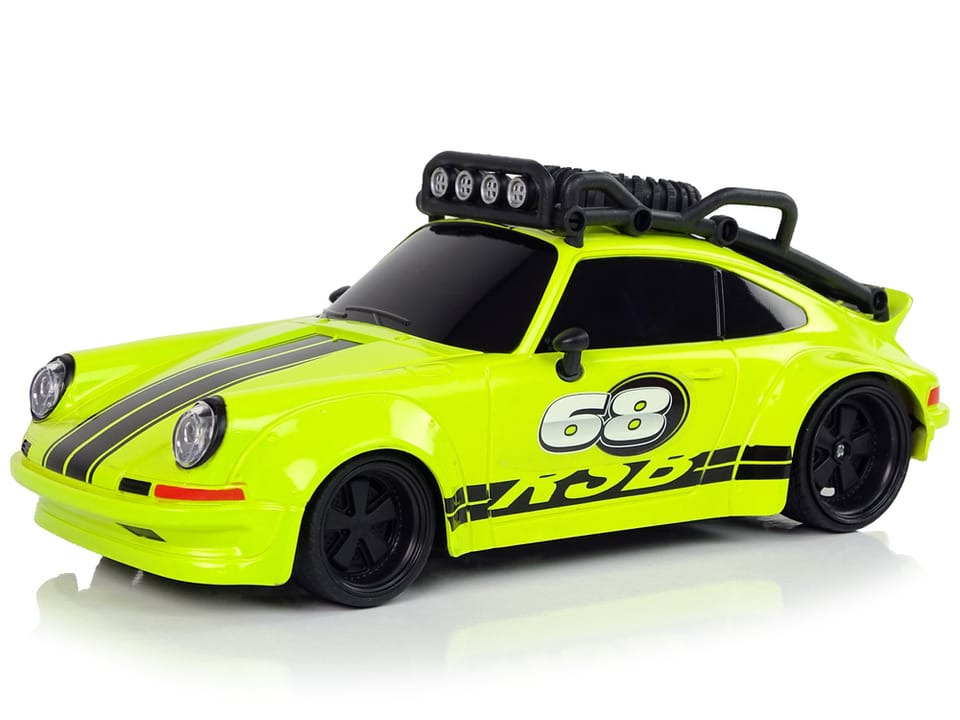 Samochód ma lekką i solidną konstrukcję, sportowy design z czarnymi pasami na dachu i masce samochodu. Wygląd zewnętrzny robi wrażenie. Na dachu znajduje się rama z kołem zapasowym i reflektorami. Podczas szybkiej jazdy nic nie zaskoczy. Gumowe opony gwarantują przyczepność do podłoża. Prowadzenie pojazdu to świetna zabawa, szczególnie dla najmłodszych. Mogą oni sterować małym modelem samochodu za pomocą pilota dołączonego do zestawu, posiada dwa oddzielne przyciski do jazdy do przodu/do tyłu i na boki.