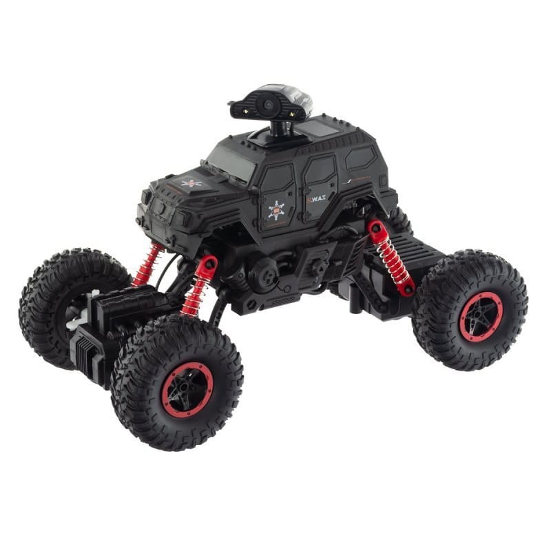 Zdalnie sterowny samochód. Zabawka posiada napęd na tylną oś oraz skrętne koła. Pojazd posiada duże gumowe koła oraz sprężynowe zawieszenie. Pilot zdalnego sterowania pozwala operować pojazdem w kierunkach przód-tył oraz prawo-lewo. Górna wieżyczka posiada oświetlenie. Pojazd posiada podświetlaną wieżyczkę. W zestawie znajduje się ładowarka oraz akumulator. Zawartość pudełka: - Samochód - Pilot - Ładowarka USB 3.6V - Akumulator Wymiary pojazdu: 29 x 16 x 19 cm Wymiary pudelka: 43 x18 x 26 cm Wiek: 6+
