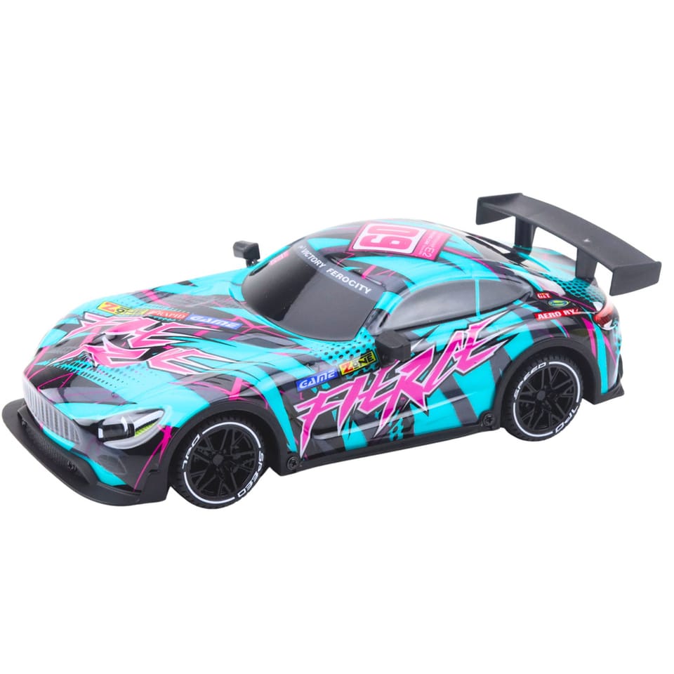 Sportowy samochód wyścigowy RC w kolorystyce turkusowo-różowo-czarnej to doskonała propozycja dla wszystkich małych fanów szybkiej jazdy i efektownej zabawy. Model został zaprojektowany tak, aby dostarczyć maksymalnych wrażeń – łączy realistyczny wygląd, pełną funkcjonalność jazdy oraz wyjątkową funkcję podświetlanej karoserii, która czyni go jeszcze bardziej widowiskowym.