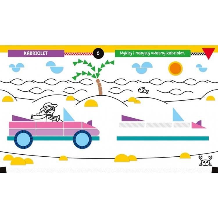 SAMOCHODY NA ULICY. WYKLEJANKA, RYSOWANKA Z FIGURAMI Wyklejanka, rysowanka z figurami to książeczka dla kreatywnego przedszkolaka. Dziecko przykleja naklejki i dorysowuje elementy, tworząc w ten sposób obrazek z figur geometrycznych. Zabawa książeczką rozwija spostrzegawczość i sprawność manualną dziecka, pomaga w utrwalaniu nazw i kształtów figur oraz ćwiczy koncentrację. Praca z książką to miło spędzony czas na aktywizującej zabawie. Rok wydania: 2022 Przedział wiekowy: 4-6 lat Oprawa: miękka Format: 20,5 x 24 cm; ilustracje barwne; uszlachetniona okładka Stron: 12; + wkładka z naklejkami