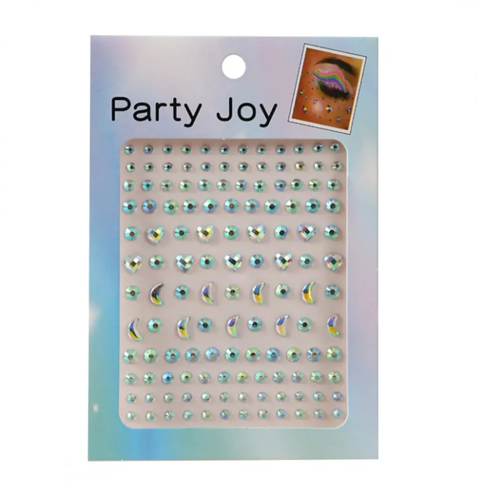 Dekoracyjna biżuteria do ciała i twarzy z kryształkami Mieniące się kryształki i perełki to niezwykle kobiecy dodatek do wielu tematycznych stylizacji. Można je przykleić zarówno na twarz, jak i ciało. Zestaw składa składa się z:- opalizujących okrągłych kryształków o różnej średnicy,- mieniących się kokardek. Sprzedaż dotyczy jednego zestawu (blistra). Instrukcja:1. Należy dokładnie oczyścić i odtłuścić skórę.2. Delikatnie odkleić kryształek z kartonika.3. Przykleić kryształek w wybranym miejscu na ciele.