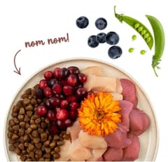 Składniki:świeże mięso z kurczaka (20%), jęczmień, kukurydza, białko drobiowe (suszone), skwarki (suszone), białko kukurydziane, świeża perliczka (5%), włókno grochu, hydrolizat białka, suszony miąższ buraczany (bez cukru), tłuszcz zwierzęcy, ryż (1%), mączka wątrobowa, olej z łososia (0,5%), węglan wapnia, groch (suszony, 0,4%), chlorek potasu, borówki brusznice (suszone, 0,1%), borówki (suszone, 0,1%), suszona pietruszka (0,1%), drożdże (suszone, 0,1%), kwiaty nagietka (suszone, 0,05%)Analiza:białko 31,0%, zawartość tłuszczu 12,5%, włókno surowe 5,5%, popiół surowy 7,1%, fosfor 1,0%, wapń 1,1%, magnez 0,09%.Dawkowanie: