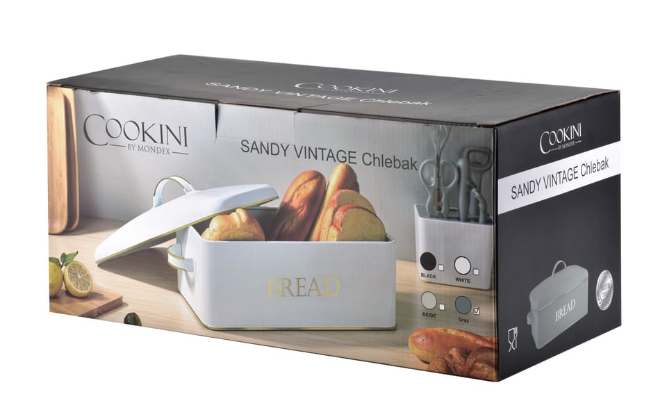 Chlebak (pojemnik na chleb) SANDY VINTAGE marki Cookini by MONDEX. Chlebak o futurystycznym, nowoczesnym kształcie w klasycznej i uniwersalnej kolorystyce. Korpus produktu został wykonany z solidnego i trwałego metalu w matowym wykończeniu. Posiada wygodną metalową pokrywę z również metalową rączką. Należy przecierać wilgotną szmatką z delikatnym detergentem lub używać środków doczyszczenia metalu. Produkt zapakowany z ozdobne opakowanie z zabezpieczeniami. Idealny jako prezent na parapetówkę. chlebak:dł39cm z uchwytami szerokość 18cm wysokość z pokrywką 21cm (z uchwytem) opakowanie jednostkowe color box 19,5x39,5x18cm