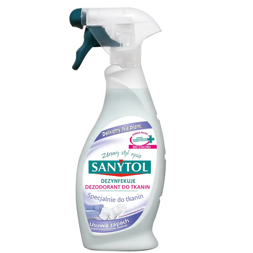 SANYTOL Dezodorant dezynfekujący do tkanin w sprayu 500ml (P1)3045206331005Spray przeznaczony do dezynfekcji ubrań. Wykazuje działanie bakteriobójcze oraz drożdżakobójcze. Neutralizuje kocie alergeny oraz pyłki. Zabija zarazki powodujące nieprzyjemny zapach. Eliminuje zapach papierosów, jedzenia, dymu, wilgoci, stęchlizny, zwierząt itp. Nie plami tkanin.Sposób użycia: Spryskać tkaniny z odległości ok. 30 cm tak, aby były lekko wilgotne. Pozostawić do wyschnięcia w przewiewnym miejscu. W przypadku uporczywych zapachów należy regularnie powtarzać aplikację produktu. Nie zostawia plam. Nie stosować do wyrobów skórzanych, zamszowych lub z jedwabiu. W przypadku delikatnych tkanin, zrobić próbę na fragmencie tkaniny w niewidocznym miejscu.