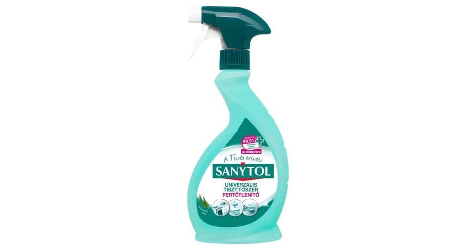 SANYTOL Spray uniwersalny o zapachu eukaliptusa 500ml (P1)3045200700005SANYTOL Uniwersalny środek czyszczący i dezynfekujący do wszystkich powierzchni. Bez chloru. Idealnie usuwa zabrudzenia i jednocześnie dokładnie dezynfekuje. Testowany dermatologicznie.Sposób użycia:nbspSpryskać powierzchnię i pozostawić na 5 minut. W celu dokładniejszej dezynfekcji, pozostawić na 15 minut. Następnie wytrzeć czystą, wilgotną gąbką. W przypadku powierzchni mających kontakt z żywnością, zabawkami lub powierzchni używanych stale przez niemowlęta lub zwierzęta, pozostawić na 15 minut, a następnie spłukać wodą.