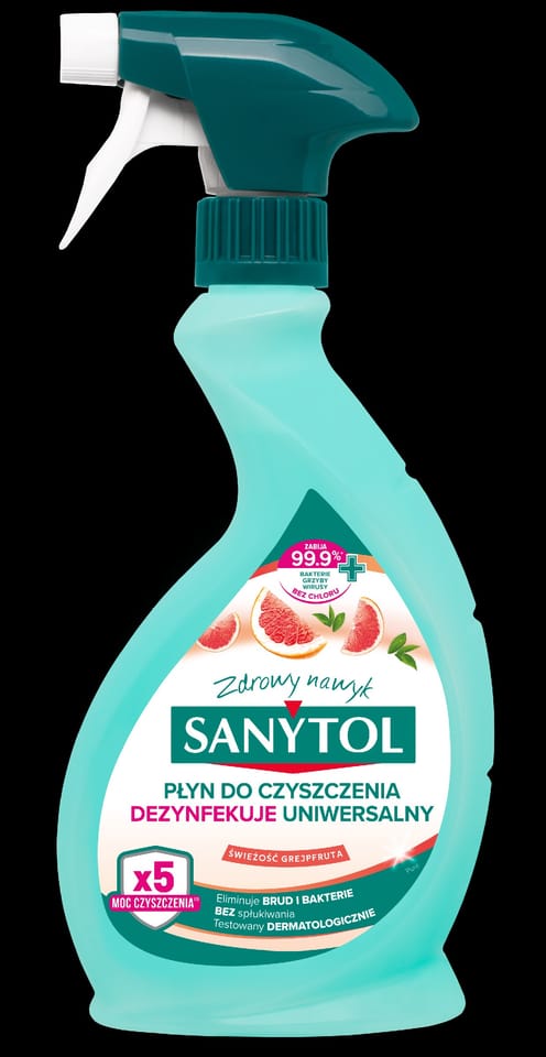 SANYTOL Spray uniwersalny o zapachu grejpfruta i trawy cytrynowej 500ml (P1)3045206312066SANYTOL Uniwersalny środek czyszczący i dezynfekujący do wszystkich powierzchni. Bez chloru. Idealnie usuwa zabrudzenia i jednocześnie dokładnie dezynfekuje. Testowany dermatologicznie.Sposób użycia: Spryskać powierzchnię i pozostawić na 5 minut. W celu dokładniejszej dezynfekcji, pozostawić na 15 minut. Następnie wytrzeć czystą, wilgotną gąbką. W przypadku powierzchni mających kontakt z żywnością, zabawkami lub powierzchni używanych stale przez niemowlęta lub zwierzęta, pozostawić na 15 minut, a następnie spłukać wodą.
