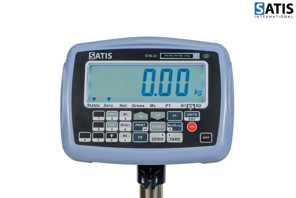 Miernik wagowy STB-22 firmy SATIS, to urządzenie precyzyjne, szybkie i wyposażone w wiele przydatnych funkcji. Może być stosowany do wag jedno lub dwuzakresowych. Jest przeznaczony do użytkowania w wagach magazynowych i platformowych. Ma trwałą obudowę z tworzywa sztucznego ABS i czytelny wyświetlacz LCD 30 mm z podświetleniem. Podświetlenie ułatwia odczyt ze znacznej odległości w miejscach w których jest mało światła oraz podczas złych warunków atmosferycznych. Posiada wbudowany akumulator 6V/4Ah z zasilaczem sieciowym, który umożliwia nieprzerwaną pracę przez ok. 20 godzin. W prezentowanym modelu istnieje możliwość przesyłania danych przez łącze RS232 do komputera lub drukarki.