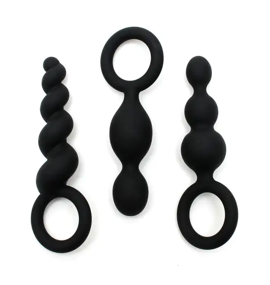 Zestaw trzech korków analnych, każdy o innej pobudzającej zmysły strukturze.