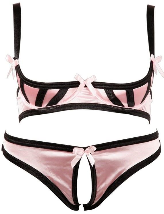 Satynowy zestaw bielizny w odcieniu różu z czarnymi wstawkami. Biustonosz z wyściełanymi miseczkami, regulowane ramiączka. Zamknięcie na haczyki z tyłu. Majteczki z otwartym kroczem. Bez pończoch.