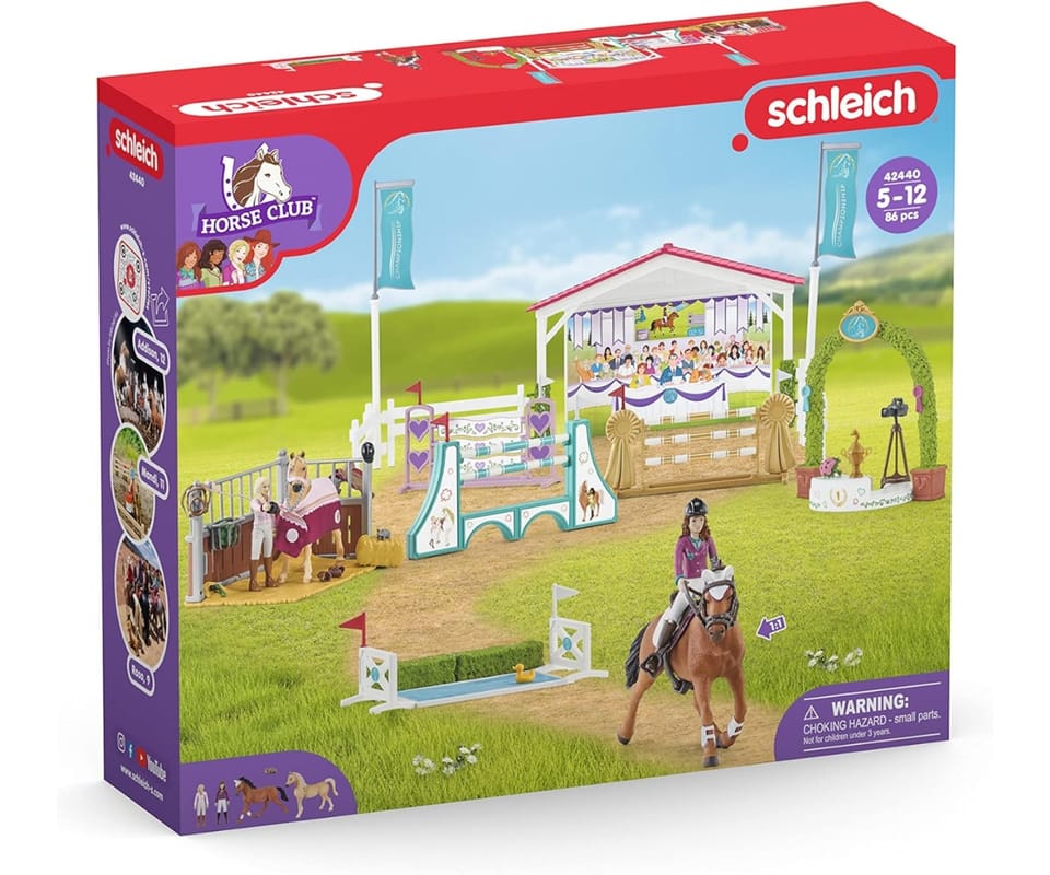 Rozpocznij ekscytujący turniej jeździecki z zestawem Horse Club Wyścigi Konne! Sofia i Lisa ujeżdżają swoje klacze – arabską i trakeńską – przygotowując je do zawodów: czyszczą, siodłają i zakładają uzdy. W pełni ruchome figurki, realistyczne konie i bogaty zestaw akcesoriów tworzą idealne środowisko do kreatywnej zabawy.Tor parkuru obejmuje stacjonaty, rów z wodą, ogrodzenie i chorągwie, a po emocjonujących skokach zawodniczki mogą stanąć na podium zwycięzców. Trybuna, kamera, dekoracje i liczne dodatki sprawiają, że każdy wyścig wygląda jak prawdziwy turniej.Zawartość zestawu (86 elementów):
