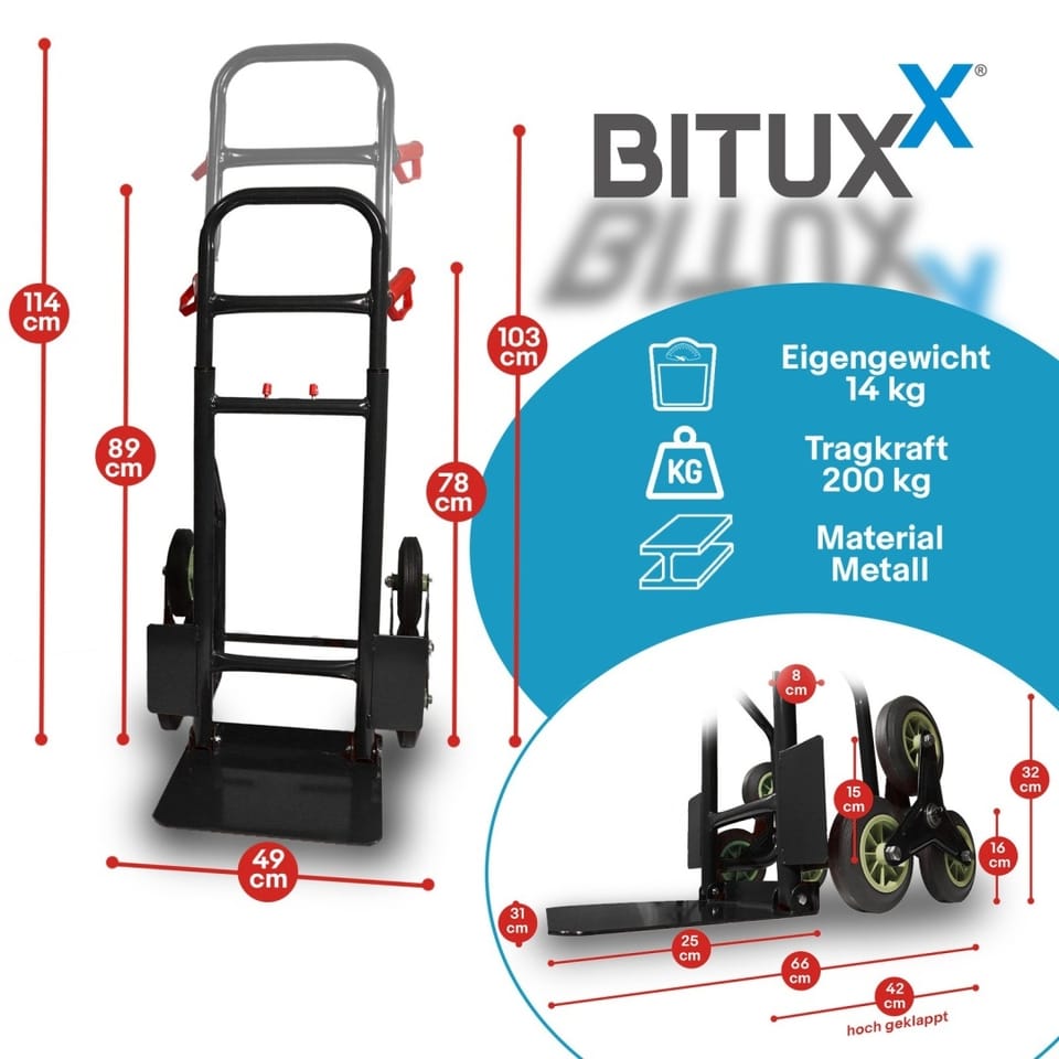 Składany wózek magazynowy wykonany z wysokiej jakości materiałów zapewni szybkie i bezpieczne transporty, zarówno po płaskiej jak i nierównej powierzchni, a także schodach. Duża płyta ładunkowa pozwala na załadowanie kartonów, skrzyń czy pojemników dużej wielkości. Teleskopowy uchwyt ułatwia pracę i pozwala na regulację wysokości. Po całkowitym rozłożeniu osiąga wymiar 114cm, złożony 89cm. Dodatkowo sztanga poprzeczna ułatwia podnoszenie ładunku. Istotną zaletą wózka jest jego kompaktowa budowa, a konstrukcja pomalowana proszkowo zapewni długotrwałe użytkowanie.