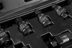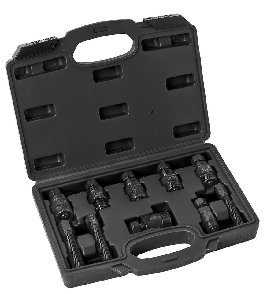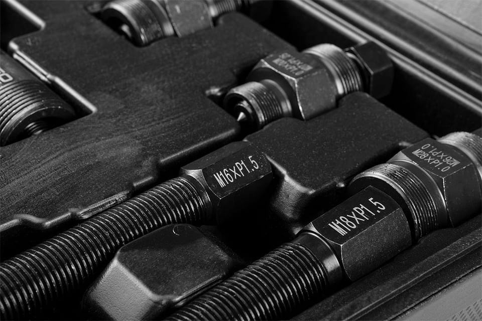 Ściągacze do kół zamachowych, zestaw 10 szt., służy do oddzielania koła zamachowego od stożka wału korbowego, pasuje do większości marek motocykli, gwinty prawe: M14 x P1,5 - R, M16 x P1,5 - R, M18 x P1,5 - R, M19 x P1.0 - R, M20 x P1.0 - R, M22 x P1.0 - R, M22 x P1,5 - R, M24 x P1.0 - R, M25 x P1,5 - R, M26 x P1.0 - R, M26 x P1,5 - R, M28 x P1.0 - R, M27 x P1.25 - R, M28 x P1,5 - R, gwint lewy: M27 x P1.0 - L;
