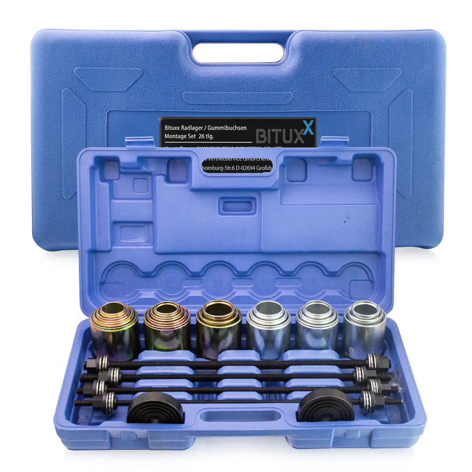 Za pomocą zestawu ściągaczy można montować lub demontować tuleje, łożyska i uszczelki. Może być stosowany uniwersalnie i doskonale nadaje się do montażu/demontażu łożysk (łożysk cichych, łożysk hydraulicznych, tulei łożyskowych, łożysk kulkowych, uszczelek i łożysk gumowych).
