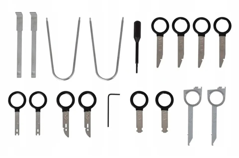 Produkt najwyższej jakości, wykonany z bardzo dobrych materiałów, co pozwala na długotrwałe użytkowanie oraz zadowolenie klienta zestaw: 20 elementów materiał: metal + tworzywo sztuczne wysoka jakość i wytrzymałość nie pozostawiają zarysowań (bezinwazyjne) zastosowanie: demontaż spinek demontaż elementów tapicerskich demontaż radia, nawigacji demontaż elementów wyposażenia i inne