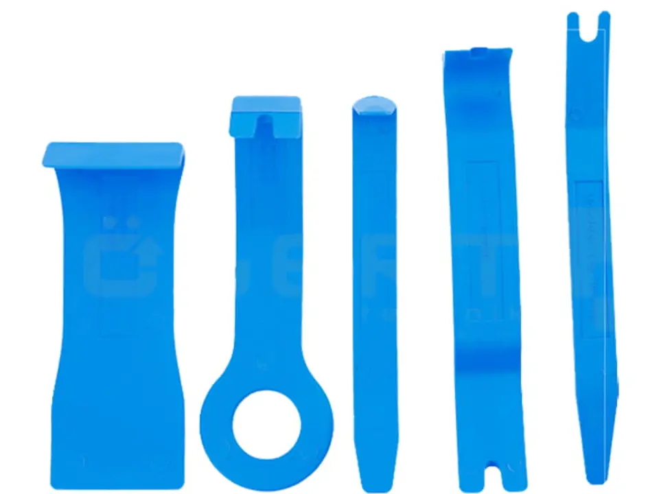 Specjalistyczne dźwignie do demontażu elementów tapicerki, spinek i listew samochodowych. Wykonane z utwardzanego nylonu. W zestawie 5 narzędzi.