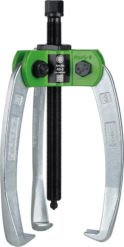 Wykonanie: Z bardzo wytrzymałymi, przenoszącymi obciążenie, samoczynnie centrującymi się ramionami do ściągacza ze stali narzędziowej z domieszką chromu. Z automatyczną regulacją chwytaków, swobodnie obracającym się wierzchołkiem centrującym oraz ulepszanym cieplnie i specjalnie powlekanym wrzecionem dociskowym o bardzo dobrych właściwościach ślizgowych. Mocny model.