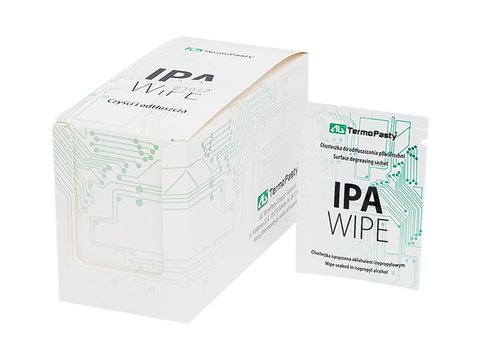 Specjalne opakowanie zabezpiecza je przed wyschnięciem i utratą właściwości czyszczących. Nadają się do usuwania brudu, kurzu i tłuszczu ze złącz czy kabli. Chusteczki IPA Wipe firmy AG Termopasty, w przeciwieństwie do powszechnie stosowanych materiałów, są neutralne chemicznie.