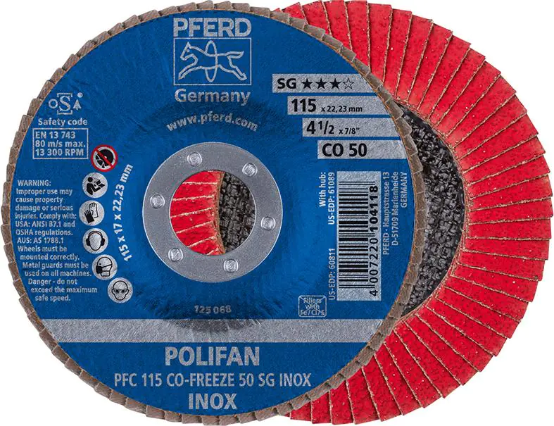 CO-FREEZE SG INOX Wykonanie: z listkami z korundem ceramicznym (CO) i specjalną powłoką chłodzącą, ze spoiwem z żywicy syntetycznej, połączona trwale z talerzem z włókna szklanego. Szczególnie chłodny szlif na materiałach trudno poddających się obróbce wiórowej. Bez dodatku wypełniaczy zawierających związki żelaza, chloru i siarki. Otwór znormalizowany 22,23 mm. Zastosowanie: do obróbki stali szlachetnej i stopów na bazie niklu (np. Inconel i Hastelloy). Nadający się do szlifowania powierzchni i obróbki spoin spawalniczych. Wskazówka: nie powstają żadne barwy nalotowe, więc nie ma konieczności dodatkowej obróbki.