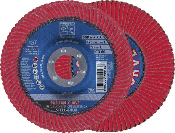 CO SGP CURVE STEELOX Wykonanie: z ziarnem ceramicznym (CO) i aktywną przy szlifowaniu powłoką chłodzącą, ze spoiwem z żywicy syntetycznej, połączona trwale z talerzem z włókna szklanego. Dzięki temu zwiększa się bardzo wydajność ścierania przy ekstremalnie długiej żywotności. Ściernica listkowa/lamelkowa jest pokryta listkami po stronie szlifowania, jak również po stronie tylnej, a także promieniowo. Bez dodatku wypełniaczy zawierających związki żelaza, chloru i siarki. Otwór znormalizowany 22,23 mm. Zastosowanie: do obróbki stali i stali szlachetnej, do uzyskiwania gładkich powierzchni. Do obróbki spoin pachwinowych, spawów, fazowania i usuwania zadzior.