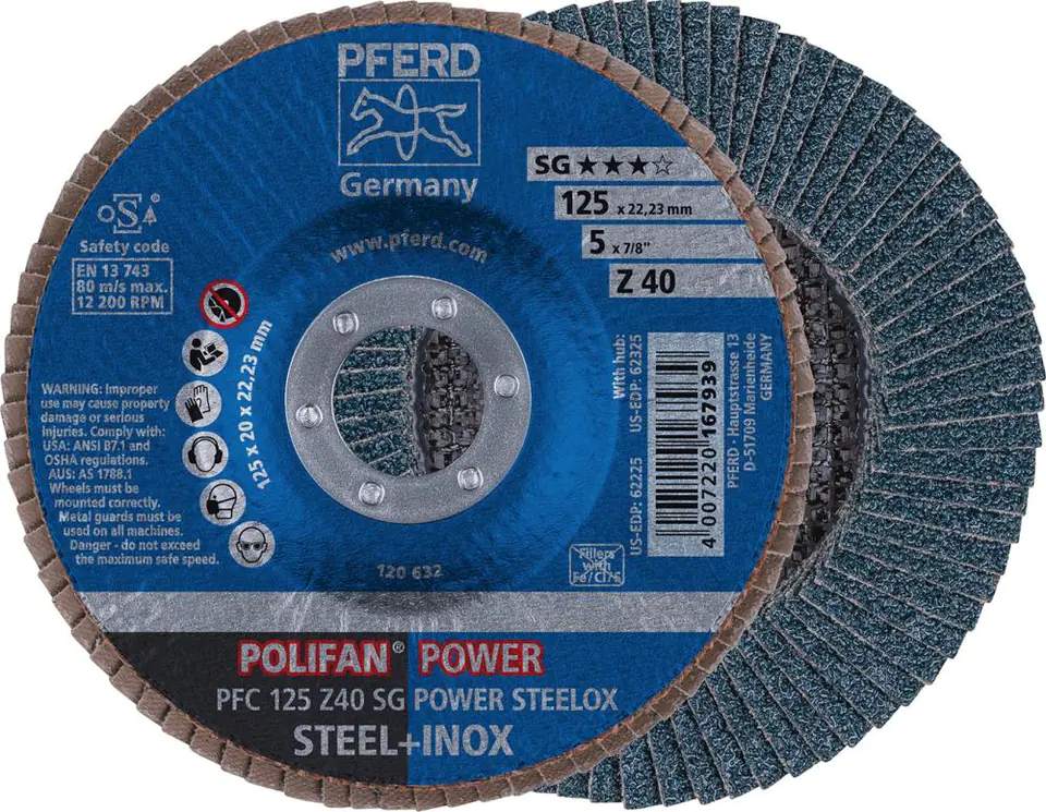 Z SG POWER STEELOX Wykonanie: z listkami z korundem cyrkonowym (Z), ze spoiwem z żywicy syntetycznej, połączona trwale z talerzem z włókna szklanego. Dzięki temu osiągana jest agresywna wydajność cięcia i wyjątkowa żywotność. Bez dodatku wypełniaczy zawierających związki żelaza, chloru i siarki. Otwór znormalizowany 22,23 mm. Zastosowanie: do obróbki stali i stali szlachetnej. Nadaje się do szlifowania powierzchni, fazowania i gratowania. Nadaje się do szlifu powierzchniowego również na stali.