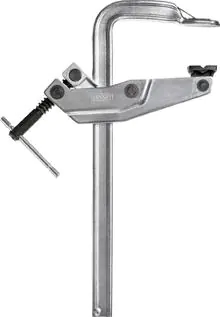 Wykonanie: mechanika napinania poza obszarem pracy. Prowadnica szynowa, nieruchome ramię i płytka dociskająca wykonane w całości ze statycznie optymalizowanego, zimnogiętego profilu stalowego, ramię ruchome z precyzyjnego odlewu ulepszane cieplnie i cynkowane galwanicznie. Śruba dociskająca frezowana na zimno i oksydowana z gwintem trapezowym. Chroniona przed spawalniczymi odpryskami. Specjalna wahliwa płytka dociskowa, polerowany odlew, z pryzmą, kąt odchylenia 30°. Możliwość zwolnienia zabezpieczenia w celu zmiany położenia ramienia ruchomego. Z pokrętłem z przetyczką.