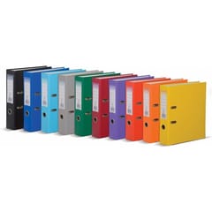 Wykonany z twardej 2 mm tektury_kolorowa oklejka pokryta matową folią polipropylenową _wyklejka papierowa _do formatu A4_szerokość grzbietu 75 lub 50 mm_mechanizm dźwigniowy z dociskiem_metalowe oczko grzbietowe_metalowe okucia owalne na przedniej okładce_wymienna etykieta do opisu_dostępny z okuciami dolnej krawędzi lub bez okuć