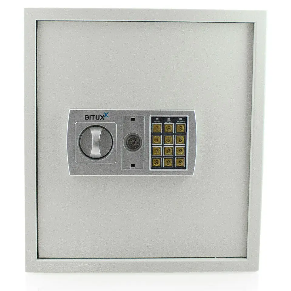 Solidny sejf elektroniczny idealny do zabezpieczenia ważnych dokumentów, kosztowności. Posiada otwory umożliwiające przymocowanie go do ściany lub podłogi. Wyposażony w półkę z możliwością demontażu. Sejf można otwierać poprzez zamek elektroniczny lub klucz. Niezwykle wytrzymały podwójny zamek.