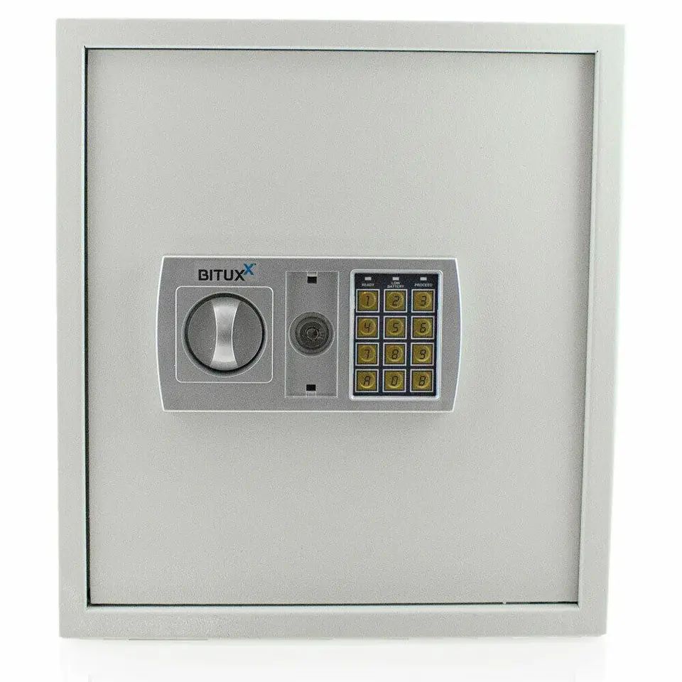 - Wprowadzając 3 razy zły kod blokuje się sejf (później można go otworzyć tylko kluczykiem ) -Wykonany z grubej i dobrej jakości blachy - Możliwość otwierania poprzez zamek elektroniczny lub klucz