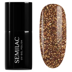 Lakier hybrydowy pełen intensywnie błyszczącego brokatu w ciepłym, złotym odcieniu z zatopionymi we wnętrzu hologaficznie opalizującymi drobkami, tworząc efekt głębokiego, wielowymiarowego blasku.