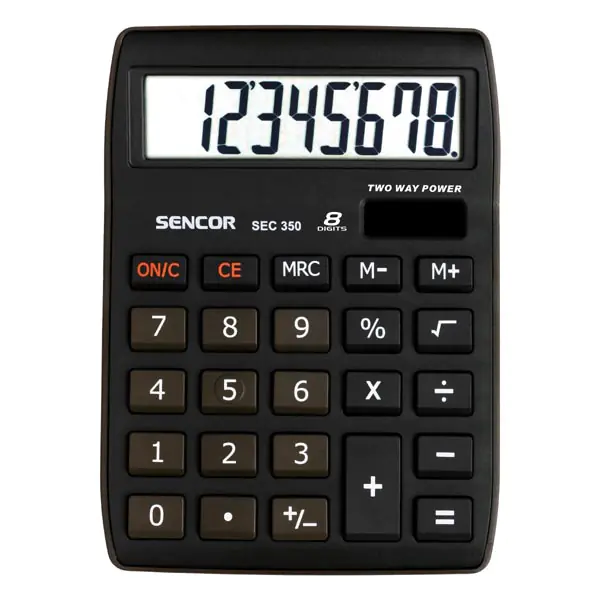 Sencor SEC 350 jest zasilany w sposób dualny – dzięki ogniwu słonecznemu i baterii LR1130, co zapewnia niezawodne działanie niezależnie od warunków oświetleniowych. Solidna i lekka konstrukcja sprawia, że kalkulator łatwo zmieści się na każdym biurku.